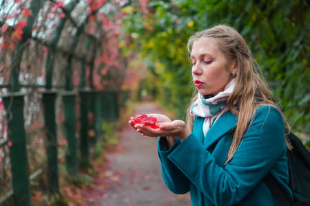 Autumn and a walk in the fresh air. A young blonde woman holds red leaves in her hands and blows them away.