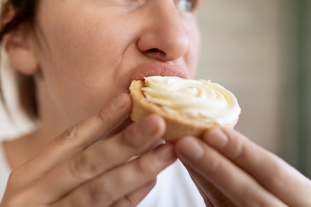 woman has a craving for sweet food and eats a cake