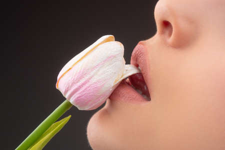 Oral sex concept. Blowjob and kiss. Sexy lips with tulip flower. Sexy female mouth and spring flower.