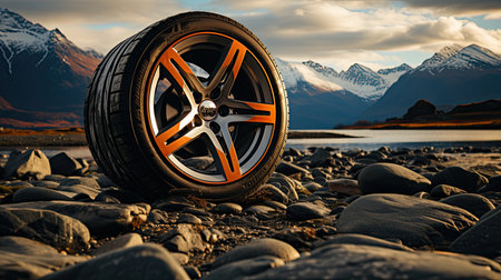 Off road treaded car wheel on top of mountain with beautiful scenery, Generate Ai