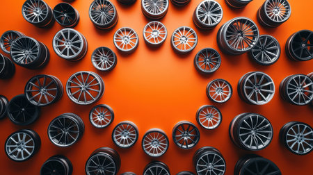 A dynamic arrangement of various car wheels showcases intricate designs against a bold orange backdrop, ideal for automotive design and marketing projects.