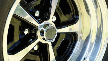 a shiny disc, black and white, a wheel of a car of old times. Close up of vehicle details. Concept of style and racing. Selective focus