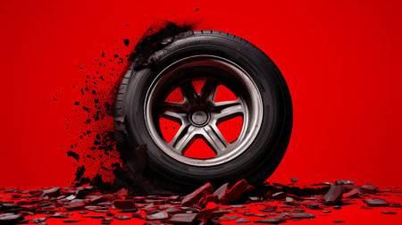 Car wheel with red paint splashes on a red background. 3d rendering