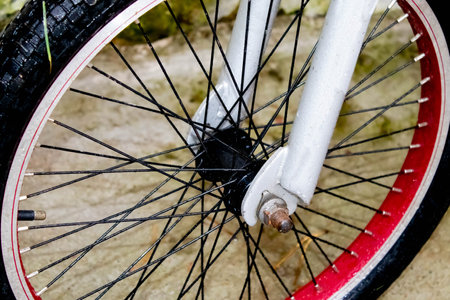 close-up of a vintage bicycle wheel in an urban environment