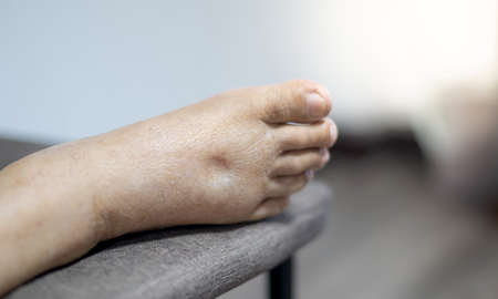 The feet of old man wrinkle skin swollen feet with the cancer and the body lack of the protein for health so not good. Fingers hit the back of the cancer foot. To test foot swelling.