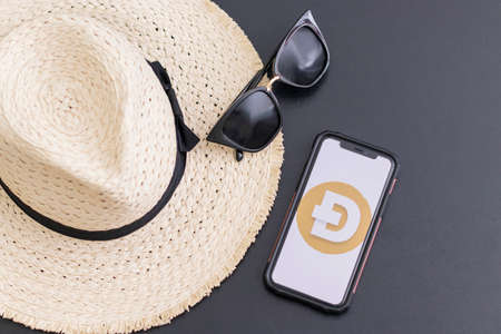 Dogecoin is a popular cryptocurrency. mobile phone or cell phone laid on a wooden table with the dogecoin app open on screen. Next to it lies a straw hat and sunglasses.