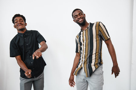 Two young black men with dark skin dancing and smiling together in casual clothes against white background. Friends enjoying music and having fun in relaxed atmosphere indoors.