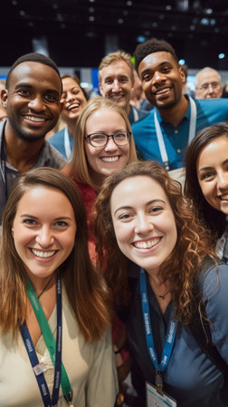 Laughing african student in blue shirt sitting with laptop between european university friends Beautiful blonde female manager making selfie during conference with collea : Generative AI