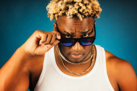 This is a studio portrait of an African American in sunglasses and a white T-shirt on a dark blue background. A swarthy guy with a fashionable hairstyle with pigtails Looks straight into the camera from under the glasses.