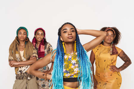 Young black four women wearing dress posing together on camera isolated over white background