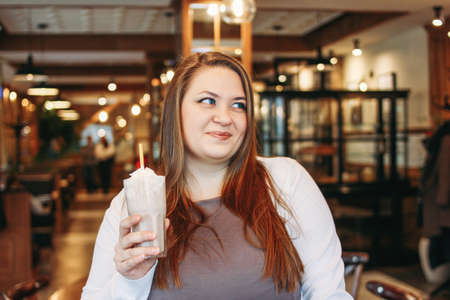 Young charming woman plus size with milkshake in hand in cafe, enjoing life and her appearance