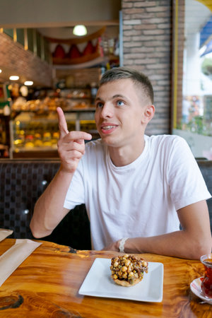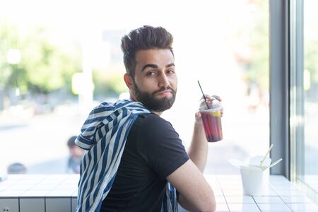 Portrait of a handsome arab man drinking smoothie in a cafe. The concept of healthy drinks and lifestyle.