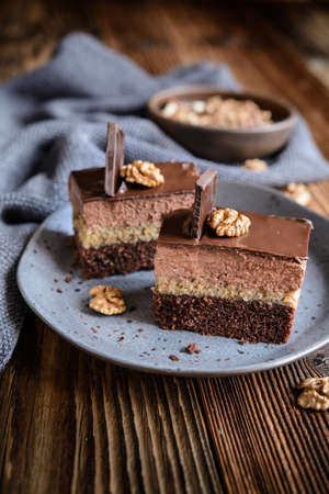 Opity Izidor, sweet dessert with walnut filling and chocolate frosting on a ceramic plate
