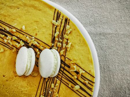 Sweet homemade honey cake closeup shot with caramel and walnuts line. Caramel and nuts background and texture