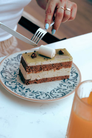 A piece of cake on a plate on the table. Top view, flat lay.