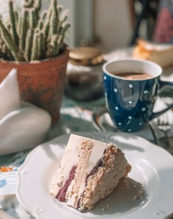 Close-up of a delicious cake slice with berry swirls, served with coffee in a polka dot mug