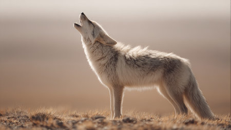 A solitary wolf is depicted in a natural environment, mid-howl. The animal's fur appears light against a blurred backdrop suggesting a daytime setting. The composition highlights the animal's silhouette. This image could be suitable for wildlife publications, educational resources, or visual content.