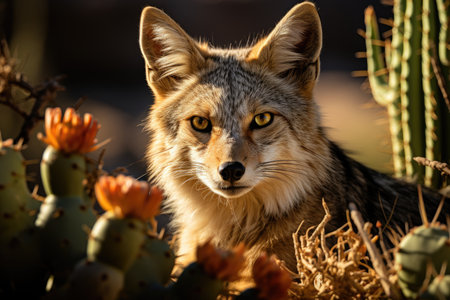 Hungry coyote among cacti under full moon in the desert., generative AI