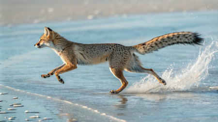 Dynamic close-up of a wild fox running fast, with sand flying in the background