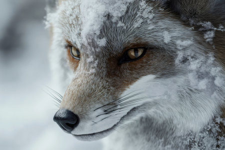 Close up view of a corsac fox, showcasing delicate snowflakes resting on its fur, creating a captivating winter wildlife portrait