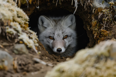 A curious Arctic fox peeks out from its snowy den showcasing its stunning fur and bright eyes This captivating moment highlights the beauty of wildlife in winters embrace