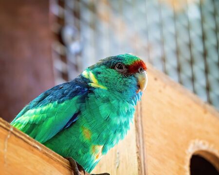 Bright and colorful lorikeet (Lorinae) sitting on a wooden pole