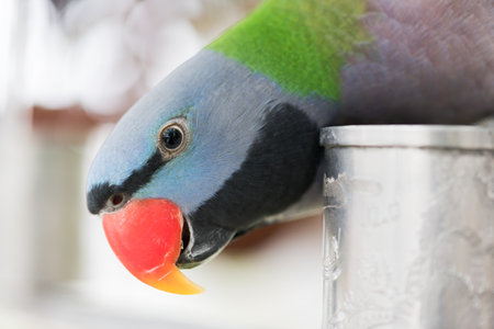 One lorikeet parrot feeding from bowl in zoo and looking in camera. Beautiful wild tropical animal bird eating nectar. Beauty of wildlife nature.