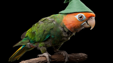A blue - crowned hanging parrot is perching on a tree trunk .