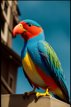 Portrait of a small colorful parrot sitting on a branch. Tropical bird, lory family. Red, blue, yellow and green colors. Close up view of the animal with a blur background. Multicolored feathers. avifauna, netherlands