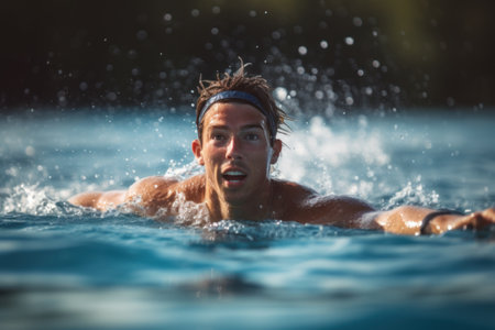 A professional triathlete trains with unwavering dedication for an upcoming competition at a lake, emanating a sense of athleticism and profound commitment to excellence.