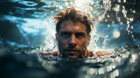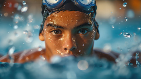 Focused swimmer with goggles emerges in pool, ready for competition