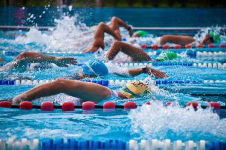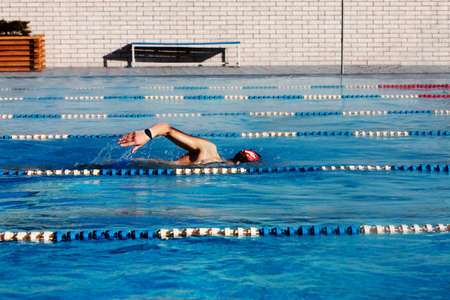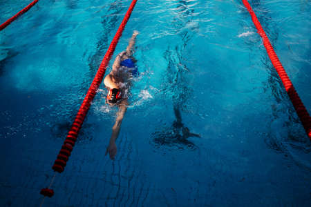 Professional swimmer competes in an indoor swimming pool race. Concept of competitions and motivation for sports