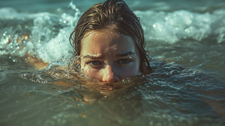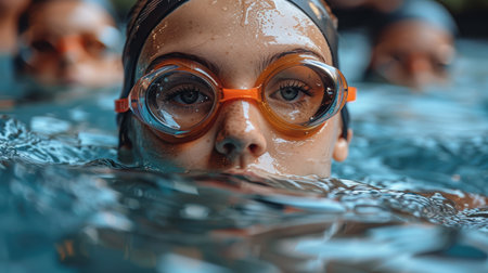 close-up swimmer's young woman face, wearing swim cap. goggles are covered with water droplets, and blurred background highlights swimmer's intense focus and determination AI generated