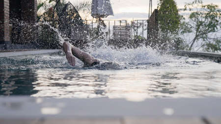 A person is swimming in the pool in an expensive villa with a beautiful view of the sunset sky. A man is swimming in a pool in slow motion, hands and splashes of water appear out of the water.