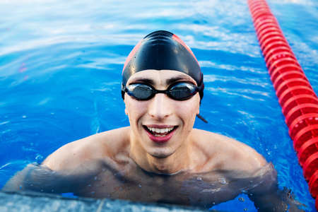 Portrait of a male swimmer in cap and goggles swimming in pool