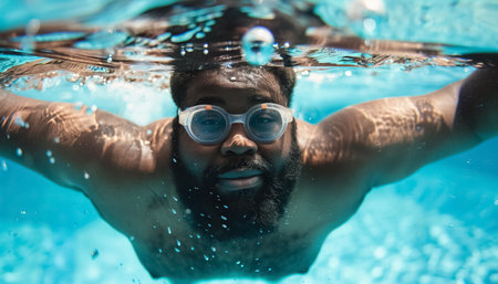 Professional swimmer doing laps underwater, with focused expression, clear goggles, and streamlined posture. Determined vibe