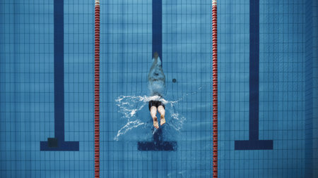 Aerial Top View Male Swimmer Jumping, Diving into Swimming Pool. Professional Athlete Winning World Championship. Top Down View.