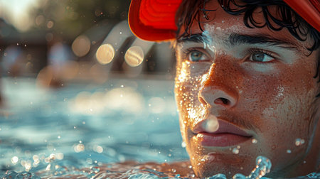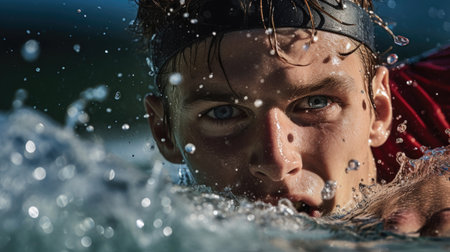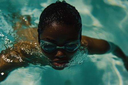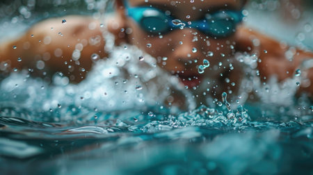 close-up shot of swimmer's face, wearing blue goggles and swim cap. goggles are covered with water droplets, and blurred background highlights swimmer's intense focus and determination AI generated