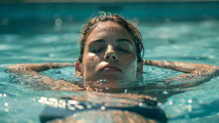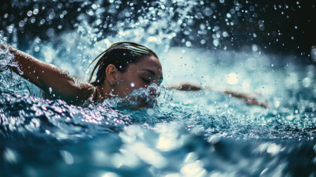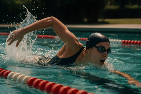 Female athlete swimming the crawl stroke in a pool under the bright sun, showcasing speed and power during intense training