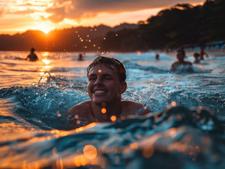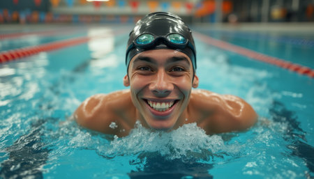 A young man with a beaming smile swims confidently in a vibrant indoor pool, showcasing his enthusiasm for the sport. The image captures the essence of joy and determination, with splashes of water accentuating his energetic movement.