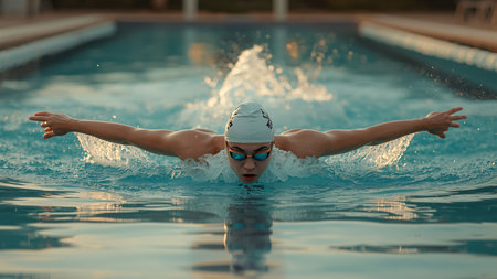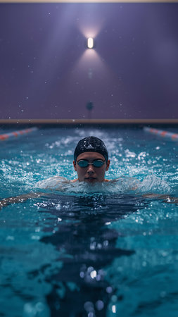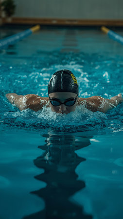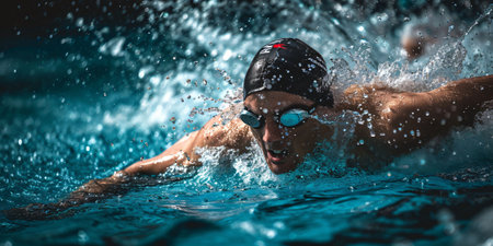 A swimmer practices in a pool, wearing sleek goggles and displaying determination. The water ripples around, highlighting the intensity of the training effort.
