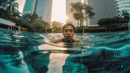 Portrait of a young asian man in swimming pool at sunset