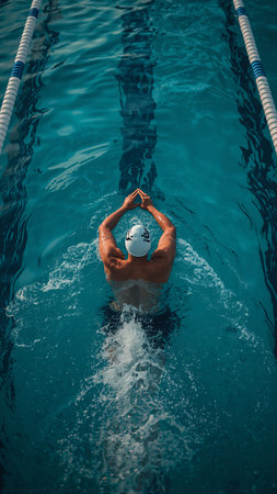 Swimmer in Swimming Pool, Professional Determined Athlete Swimming, Butterfly Technique Training in Pool Aerial Top View, Generative AI Illustration