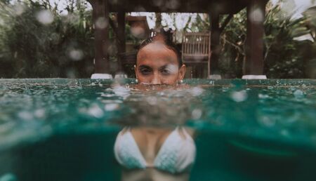 Unrecognizable woman in the pool water. Tropical vacation theme concept. Summer holiday background.