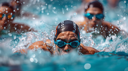 Focused swimmer with goggles and cap creating dynamic splashes in the water during a competitive swimming race.