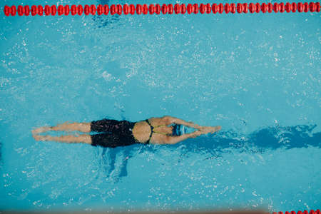 top view of a sexy beautiful reddish woman in black bath costume swimming backstroke in the swimming pool of a spa centre