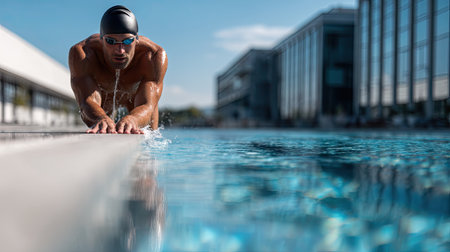 Athletic male swimmer in a cap and goggles, crouching by the pool edge, preparing for a powerful dive