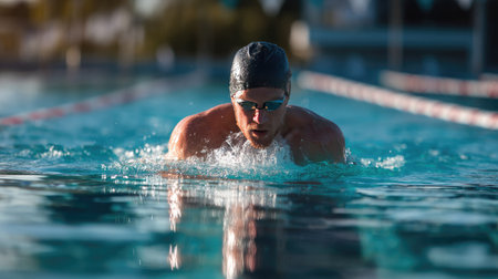Intense Male Swimmer Mid-Stroke in Sunlit Pool