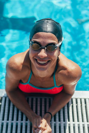 smiling woman in swimsuit, goggles and cap in swimming pool near border, looking at camera