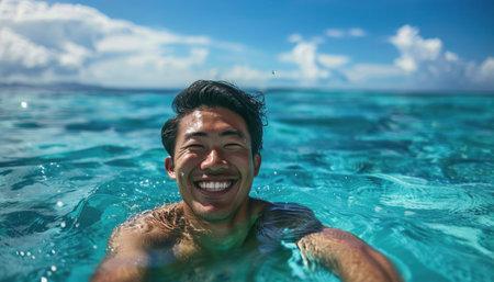A man smiles swimming in azure ocean, surrounded by nature and sky. Includes water, smile, cloud, nature, and travel